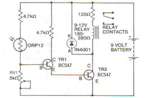 Found in a foreign publication, this sensitive circuit triggers a relay. The voltage depends on the relay and the sensitivity set in RV1.