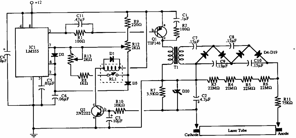This high voltage gas laser source was found in an American publication from the 1990s. The circuit has an input for PWM modulation.