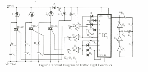 This control for a traffic light with incandescent lamps was obtained from an English documentation. The triacs must be according to the power of the lamps.