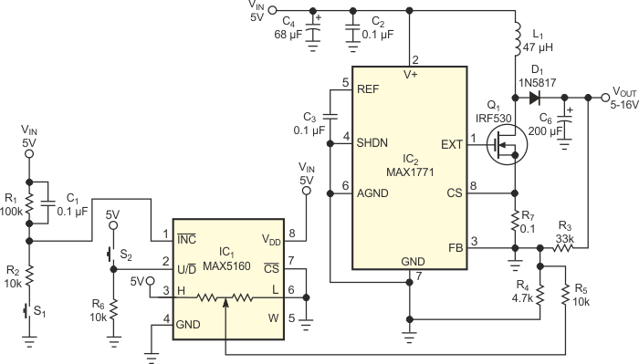 Using Maxim components, this circuit consists of a regulator to a boost converter. The circuit operates in the indicated voltage range. The MAX5160M consists of a digital potentiometer.