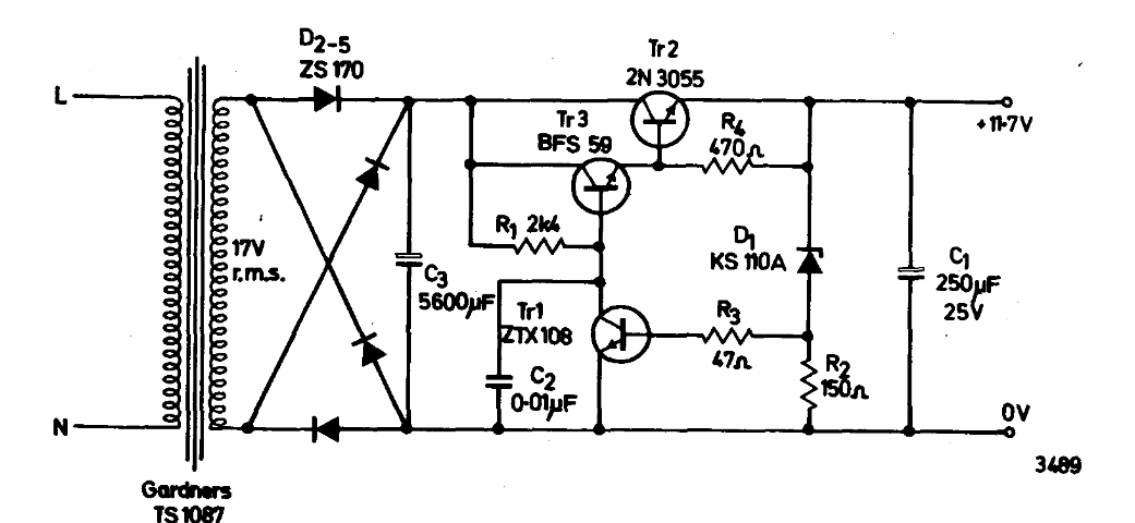 This stabilized power supply was found in the 1974 Ferranti transistor manual. The power transistor must be mounted on a heatsink.