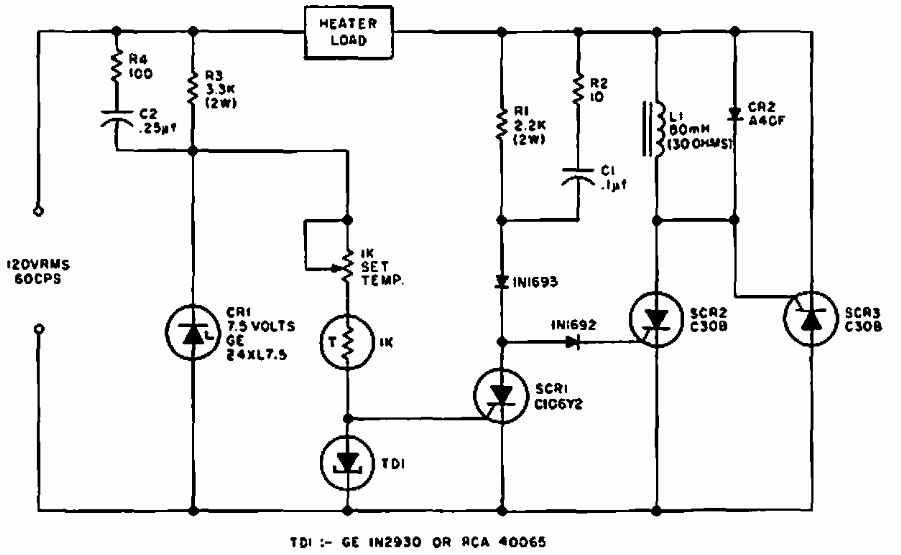 This circuit was obtained from a 1967 GE SCR manual. The SCRs must be rated for the wattage of the controlled heating element.