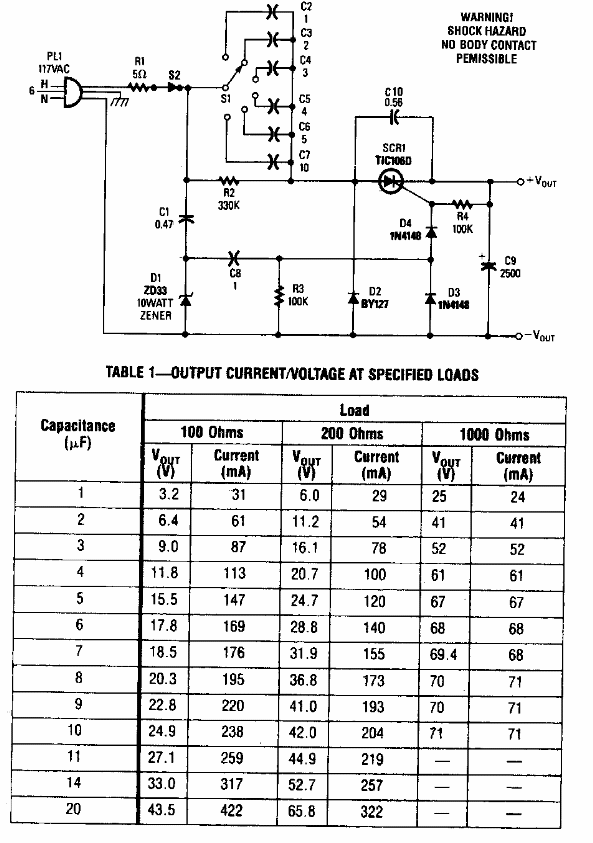 This transformerless power supply uses an SCR as a regulator. It was found in a Popular Electronics from the 1990s. The table gives component values according to voltage and current.