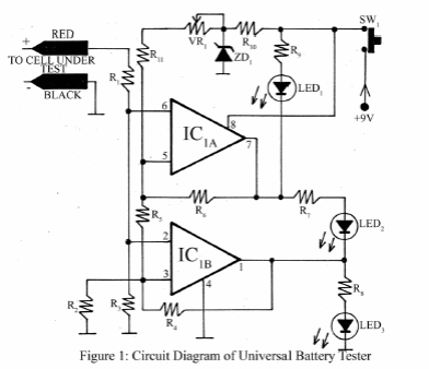 This circuit was obtained from an English circuit manual. Components are common and LEDs can be 3 different colors depending on battery status indication.