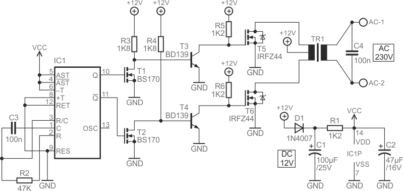 This inverter for 230V (220V) loads was found in the 2021 Internet documentation and is based on Texas Instruments 4047. The circuit can also operate with 110 V output and 50 or 60 Hz. The maximum input current is 5A.