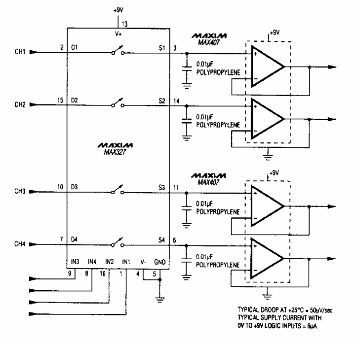 We found this circuit in a Maxim documentation from the 90s. The 4-channel circuit uses a component of the time and has a supply current of only 6 uA.