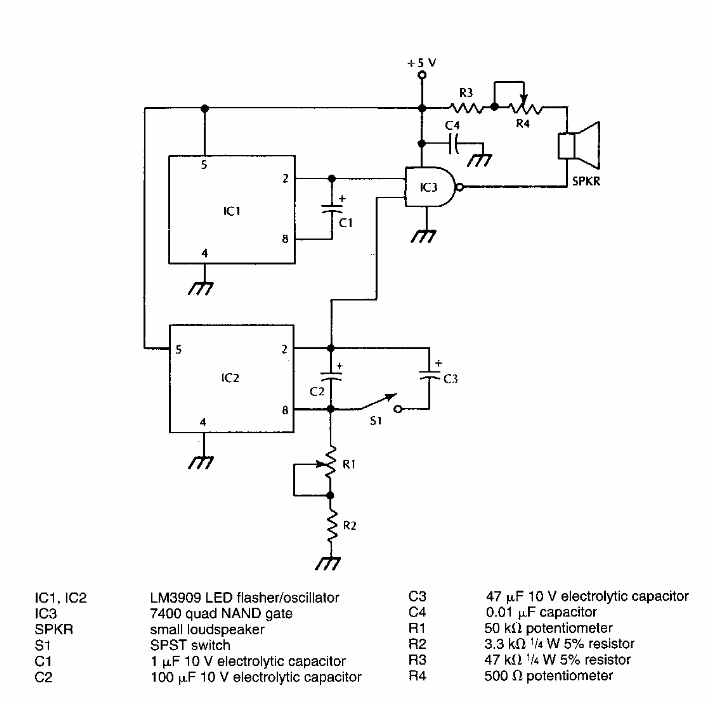 We found this circuit in an American documentation from the 1990s. The circuit is based on the LM3909, a low power oscillator from National Semiconductor.