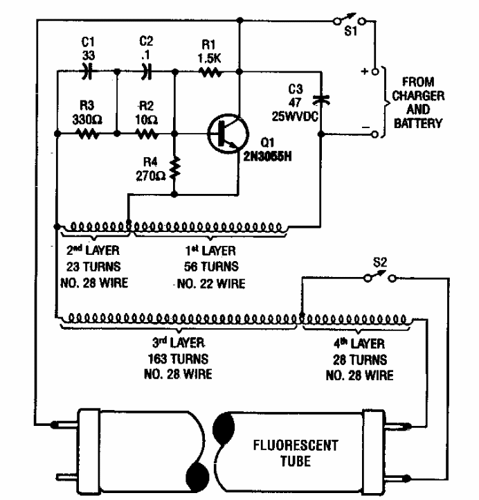 This circuit, with a 12 V input, was found in a Popular Electronics from the 1990s. Information is given about the ferrite-wrapped transformer. The transistor must be mounted on a heatsink.