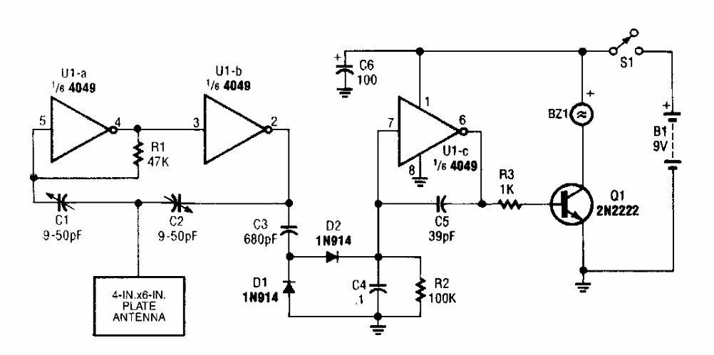 This circuit was found in a Popular Electronics from the 90's. The components used are common and instead of the buzzer we can use an LED or a relay.