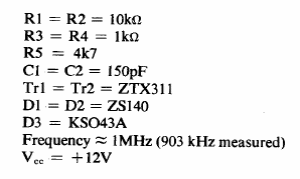 This circuit was found in a 1974 Ferranti transistor manual. The transistors are general purpose, and the frequency is approximately 1 MHz.