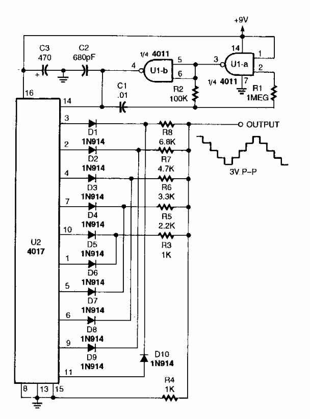 Using a 4017 as a base, this circuit from a 1990s Popular Electronics generates low-frequency ladder-like signals. The frequency is given by 4011.