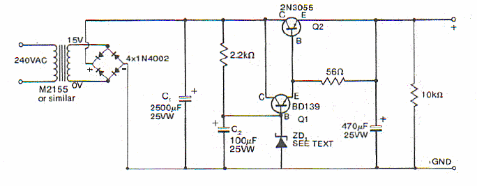 The transformer in this power supply can have a secondary winding from 1 to 15 A of current. Voltage is given by the zener diode. Transistor 2N3055 must be mounted on a good heat radiator.