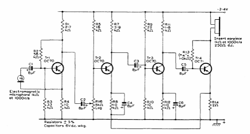 This 4-stage amplifier was found in a Mullard transistor manual from 1960. The circuit has a quiescent current of only 0.3 mA.