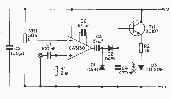 The basis of this circuit is a CA3130 operational amplifier. The transistor can be BC548, and the power supply need not be symmetrical.