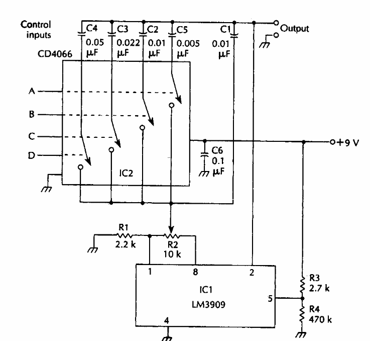 Found in American documentation from the 90s, this circuit has the signal frequency determined by capacitors from C4, C3, C2 and C5 selected by digital switches.