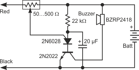 This circuit uses a PUT, a component not very common nowadays. Its purpose is to provide an audible signal for low resistance measurements with false measurement clipping.