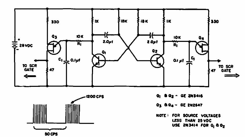 We found this circuit in a 1965 General Electric manual. The components are from the period. Time resistors and capacitors can be changed.