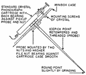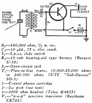 Found in a Raytheon manual from the 1960s, this simple amplifier uses a metal rod attached to a crystal transducer to detect vibrations. The phone is high-impedance magnetic.