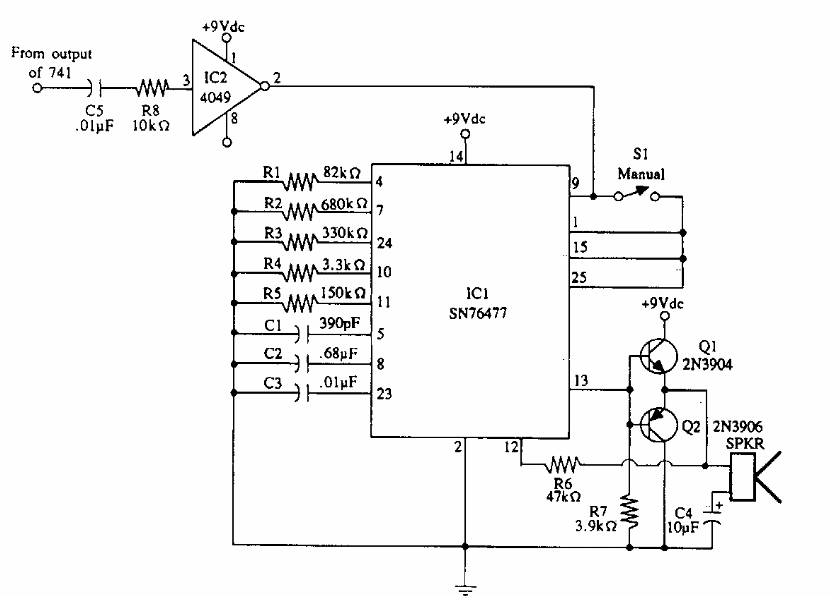 Found in documentation from the 1990s, it uses a sound effects integrated circuit, the SN7677 from Texas Instruments. Unusual component these days.