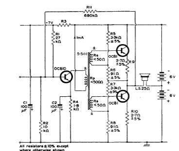 This circuit was found in a Mullard transistor manual from 1960. Note the symmetrical power supply. Transistors are germanium types from the time.