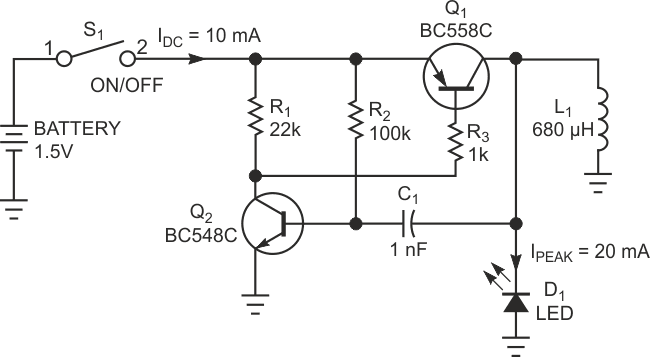 This common transistor-based circuit provides power for 20 mA common white LEDs from a single 1.5 V battery.