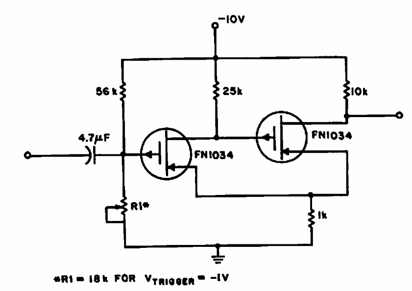 This circuit was found in a 1967 Electronic Design. FETs are from the time, so modern equivalents can be used.