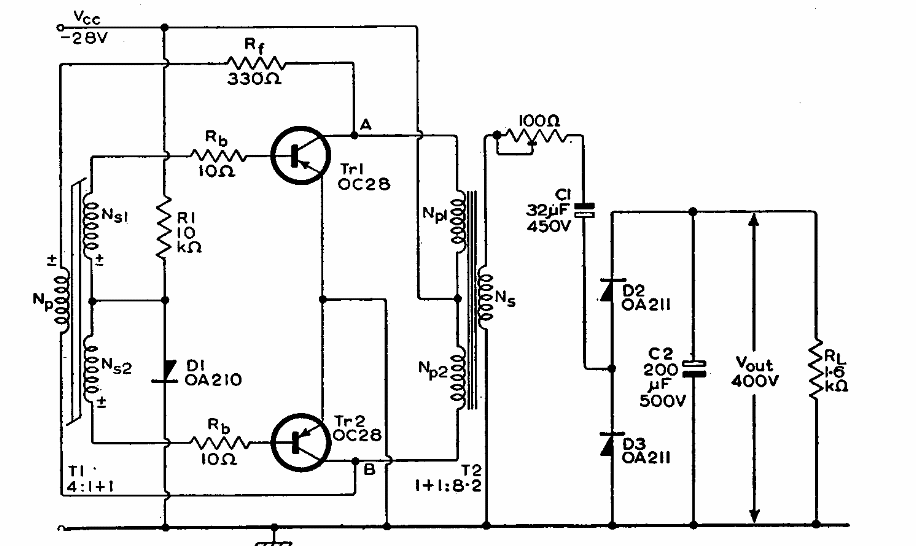 This voltage inverter circuit was found in a Mullard transistor manual from 1960. Information on the transformers was given. Transistors are germanium types.