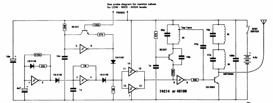 This circuit was found in an Australian publication from 1991. It is a transmitter that transmits a signal when it detects moisture. The range is on the order of a few tens of meters.