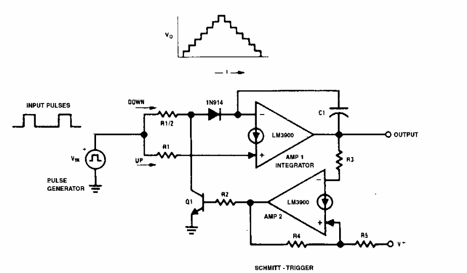Found in National Semiconductor documentation this circuit converts a rectangular signal into an up-down ladder. The power supply must be symmetrical.