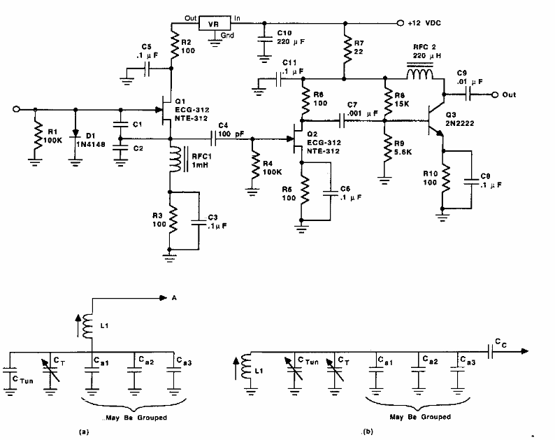 We found this circuit in a magazine 73 from the 90's. It is a circuit indicated for radio-amateur transmitters with the frequencies determined by the sets of coils.
