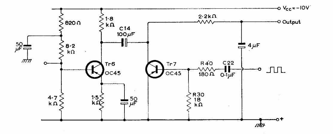 Found in the 1974 Ferranti transistor manual, this Schmitt trigger circuit uses general-purpose transistors...
