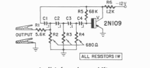This circuit for low frequency signals was found in a publication by Gernsback from 1960. The transistor is made of germanium of the time.