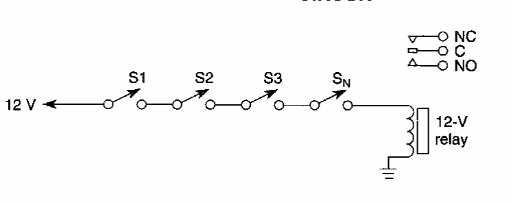 Found in an American brochure from the 90s, this circuit shows how we can implement a 4-input AND gate with relays and switches.