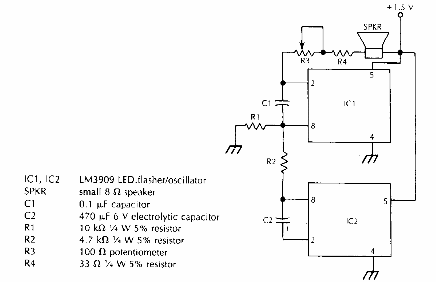 This circuit was obtained from an American documentation from the 90's. The components can be changed, and a power step can be added for greater sound volume.