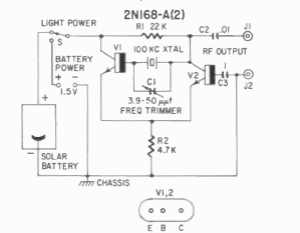 This solar cell powered circuit generates a standard 100 kHz signal. The circuit is from a 1960 Gernsback documentation.