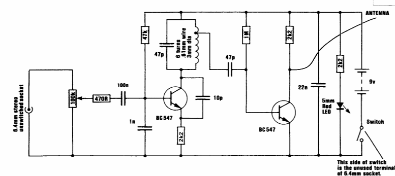 We found this circuit in an Australian publication from 1991. It is a kit of the time with input for a guitar pickup. The range is a few tens of meters.