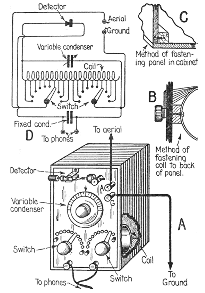 This receiver is from a 1922 publication by Hugo Gersnback. The coil can be formed by 100 turns of wire 28 in a tube of 5 cm in diameter with derivations every 5 turns, for example. The switches select the position of best reception. The detector can be a galena crystal or a 1N34 diode.