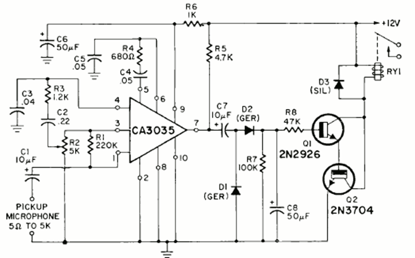 This circuit was found in the February 1970 issue of Radio Electronics magazine. The integrated circuit is a type of the time. It consists of a high-gain differential amplifier.