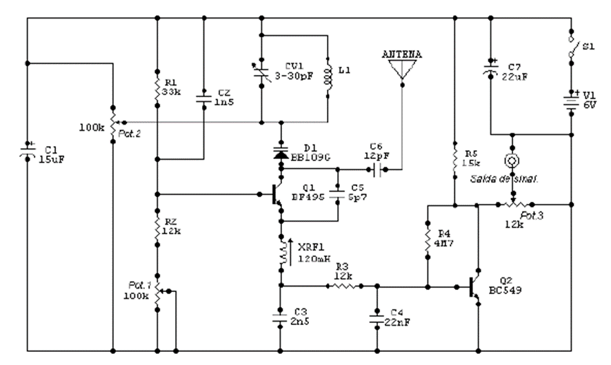 This circuit was sent by reader and collaborator Adriano Muniz Moura from Pirapora – MG. The project presented is used for reception in the FM band (87.9MHz to 109.9MHz) and can be used in conjunction with an audio amplifier and can capture stations located several kilometers away. The base of the circuit is a varicap diode, thus steadying the signal received by the receiver and the antenna used can be any common telescopic type. The resistors used are 1/8 w and the capacitors are for 12v. The power source used can be anything that has good filtering or even AA batteries. The variable capacitor CV1 is a 3-50pF common plastic type and the coil L1 is made up of 5 turns of 18 wire with a 1cm diameter without a core and can be adjusted together with a trimmer (by tightening it). The pot1 and pot2 potentiometers are used to adjust the selectivity of the circuit and for better use of it, its output can be taken to the amplifier. The plate used must be fiberglass for better signal quality.