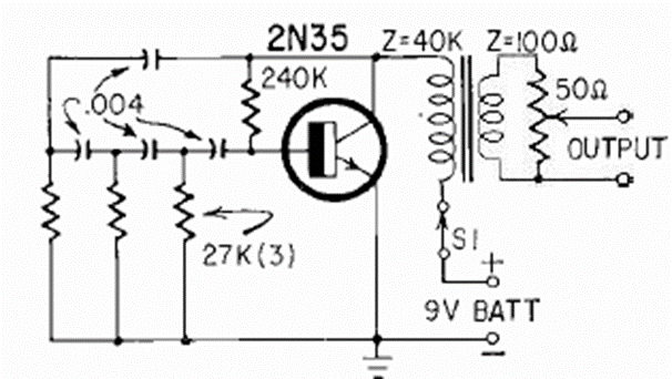 This circuit is from a Radio Electronics from August 1964. The transistor is from the time, but the circuit can be created with modern equivalent transistors. The transformer is the driver type from old transistor radios.
