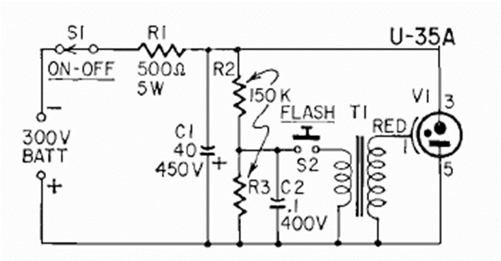 This circuit fires a xenon lamp being powered by a 300 V battery. The circuit is from a Radio Electronics from November 1964 and was used to scare people. It can be designed with a battery-powered inverter.