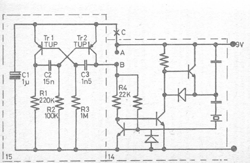 We found this circuit in an old English publication. Transistors are general purpose and the block between the dotted lines is the previous circuit. The modulation frequency is given by C2 and C3.