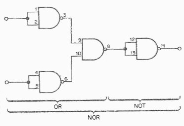 The configuration below shows how to use the 7400 as a NOR function. The circuit is TTL and must be powered with 5V.