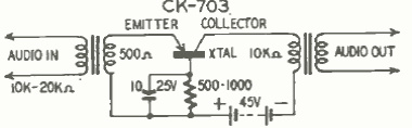 This circuit is from a Radio Electronics from 1950. The transistor was still new and called a crystal triode, a name that did not stick. The circuit used the CK703.