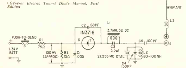 We found this circuit in a 1963 Radio Electronics. It can be used for remote control. The frequency depends on the coil and the power is supplied by a single battery.