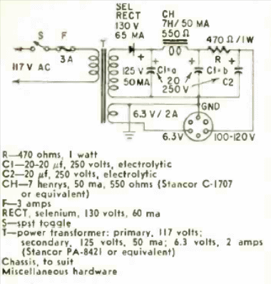 This small power supply with selenium diode appeared in Radio Electronics in October 1958. The current depends on the diode and the transformer used. There is a high voltage output for tube circuit.