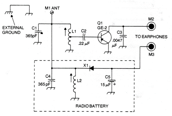 This circuit, already explored in other publications, uses the signal from a strong station to obtain the energy that feeds the amplifier stage. Germanium transistors should be preferred, and the headset should be of high impedance. The coils are for the medium wave band and the antenna should be very long.