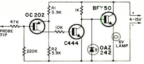 This circuit is from a Radio Electronics from February 1970. The circuit has a light bulb as an indicator but can be made with LEDs and modern transistors. With 5 V the circuit is TTL compatible.