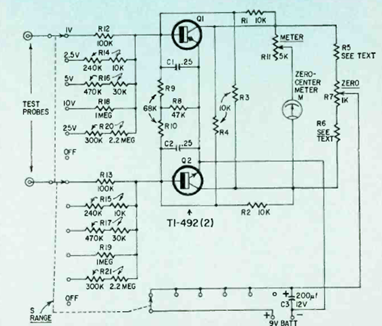 This sensitive two-transistor circuit was found in the June 1965 Radio Electronics magazine. The circuit has low drift and uses an analog instrument. The input resistance is high.