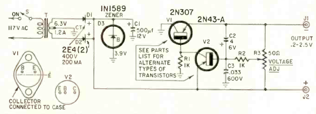 This power supply circuit, slightly different from the conventional one, was found in the Radio Electronics magazine of April 1961. The power transistor must be equipped with a heat sink. The current is 1.7 A.